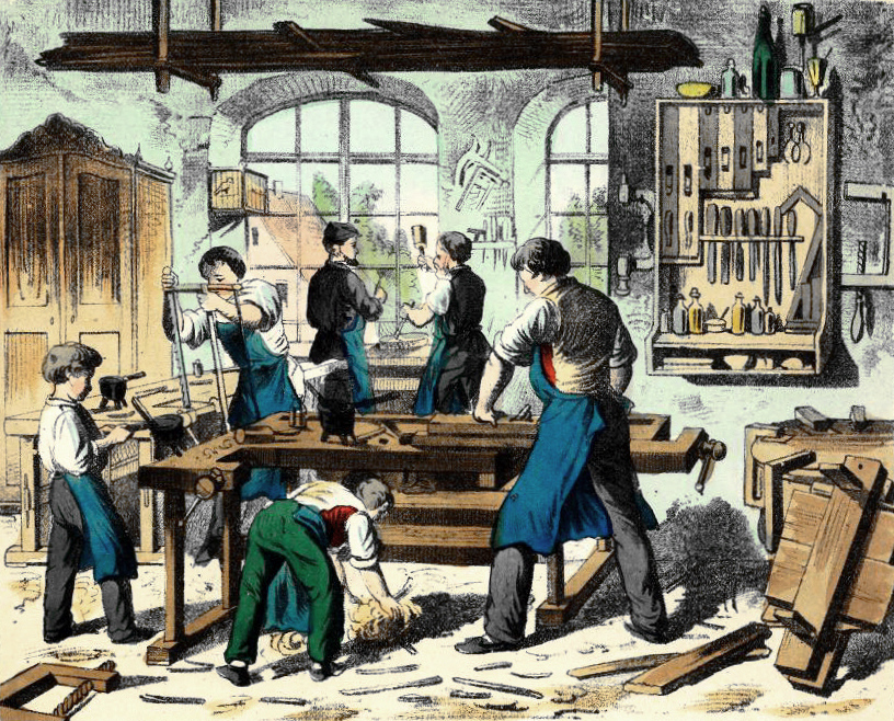 So sah das Tischlerhandwerk noch um 1880 aus. Heute arbeiten wir zeitgemäß längst mit modernsten CNC-Maschinen, CAD-Design und intelligentem Supply Chain-Tools.